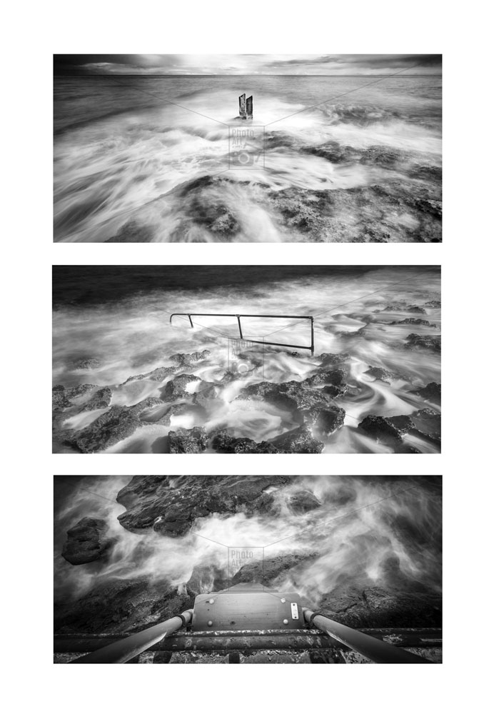 This collection of three monochrome seascapes prints showing elements of man-made structures being battered by the Mediterranean sea – a reminder that no man built structure can withstand the power of nature. Images taken in Sliema and Valletta locations.